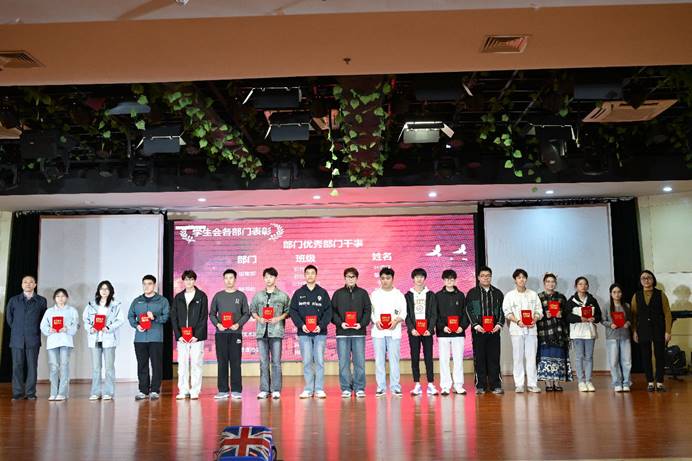 晚会的高光时刻,属于每一位踏上领奖台的信息工程学子。在经久不息的掌声中,过去一年在各个领域崭露头角的先进集体与个人依次登场,从文明修身活动中脱颖而出的宿舍与个人,到在运动会、打字、绘画、羽毛球等赛场上挥洒汗水的运动健儿;从在故事分享、视频创作中展现才华的文艺之星,到在植树劳动中默默奉献的先进班级——他们的名字被一次次响亮地念出,映照着他们因奋斗而闪亮的青春。随后,学生会的精英骨干们迈着自信的步伐走上舞台,六个部门的特色奖项以及“优秀学生会干部”“优秀干事”的荣誉,是对他们幕后辛勤付出的最好肯定。在庄重的乐曲声中,荣获“五四红旗团支部”的集体代表和“优秀团干部”“优秀共青团员”们接过证书,他们将五四精神的火炬高高擎起,展现了新时代青年的责任与担当。这一刻,会场内闪耀的不是冰冷的奖项,而是每一个奋斗故事凝结成的璀璨星光。